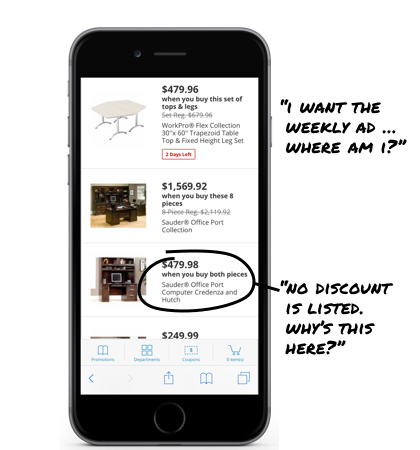 First, no matter how the content was labeled, many weekly ad users felt they'd taken a wrong turn as soon as the familiar visuals of the pages went away.