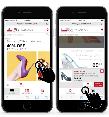 From there, users can find out extra details on the item that may not have appeared in print (extra images, etc.), add it to their cart, and then continue browsing. This site did offer more traditional means of browsing, like keyword search or department selection, but testing showed this new approach to page browsing was the "happy path" for most users.