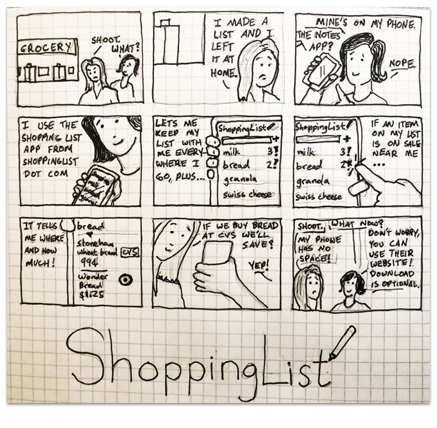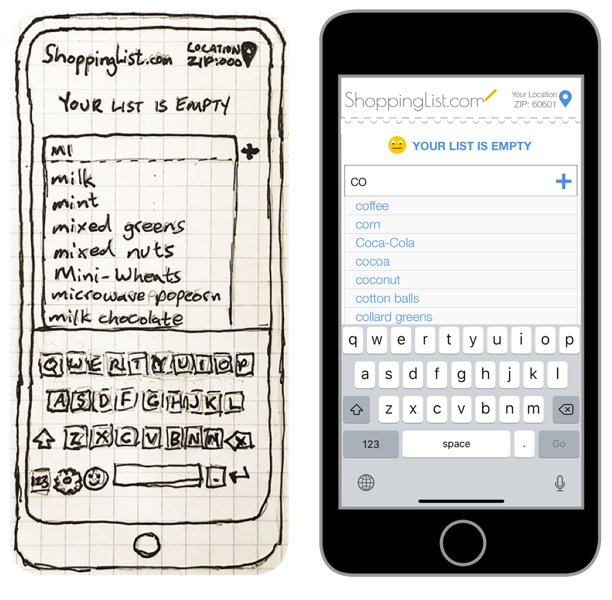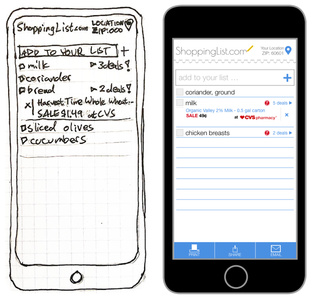The value proposition was an ultra-lightweight app (as well as a website with similar functionality) to do one easy thing: create and store a shopping list. I designed the UI rapidly, as part of a "hack-a-thon" Shoplocal hosted on an annual basis, but the simplicity was intentional. I wanted a look and feel no more intrusive than notebook paper. Developers on my team worked from sketches to build the functionality, while I designed the UI and handled front-end coding in parallel.